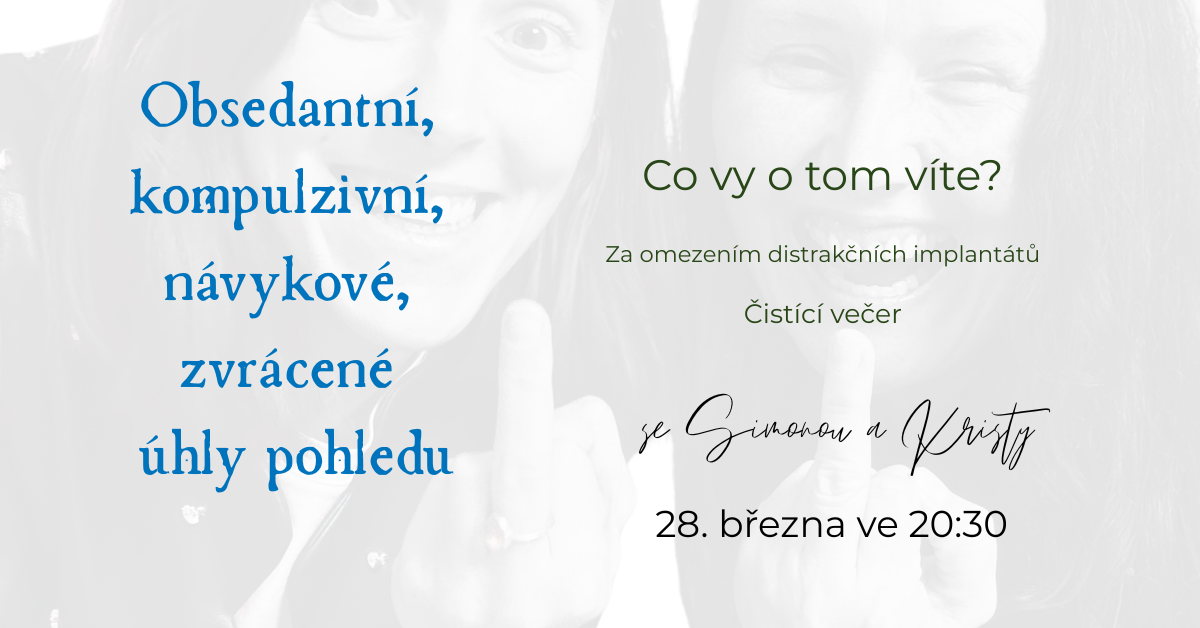 První byl o vzteku. To znáte. Jak v něm jste, není jiná možnost. Reagujete. Druhý byl s tématy obviňování, hanba, lítost, vinna. To, když ten vztek přejde, následuje často toto kolečko. Krásně se doplňují, že? A teď nás čeká třetí večer – Obsedantní, kompulzivní, návykové, zvracené úhly pohledu.